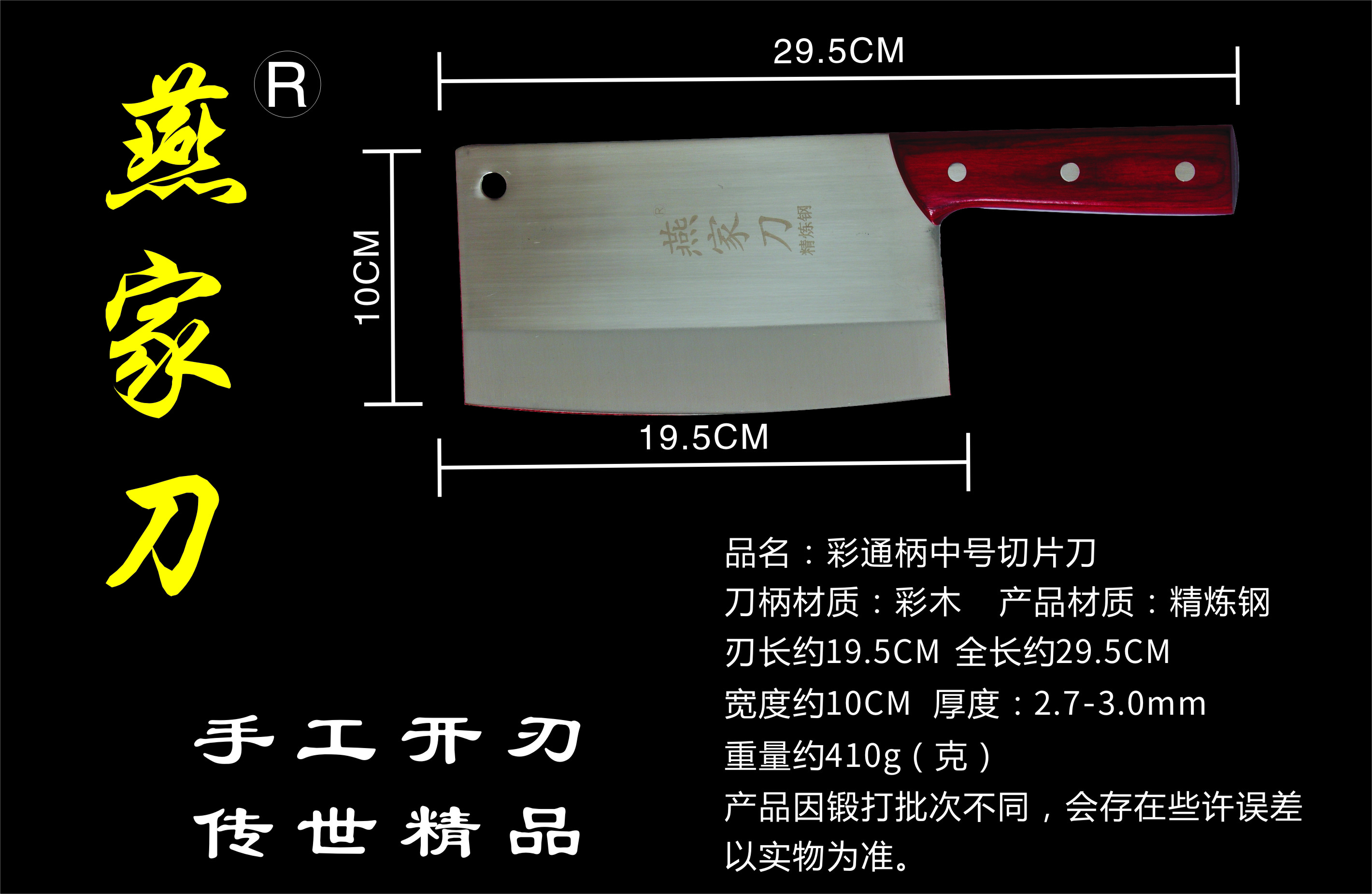 樂山燕家刀具有限公司(公司前身為燕佳鐵匠鋪),公司坐落于美麗的佛都之鄉樂山嘉州,在全國各地有上千家代理經銷點,公司專業銷售、設計、制作各類刀具。秉承一貫鍛造三精要求,即選料精、用料精、工藝精。所選材料全部產自滇東鐵礦優產區。本品牌刀具堅持千挑萬選為材,千錘百煉為刀的手工鍛造工藝宗旨。具有鋒利耐磨、持久耐用,用料上乘,硬度高、韌度強的特點!